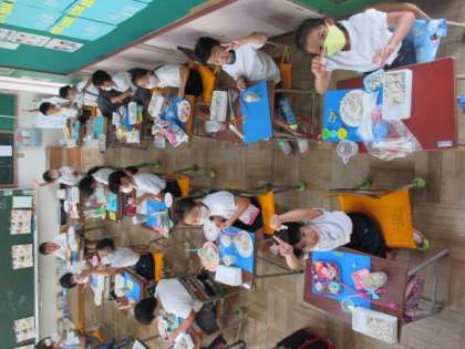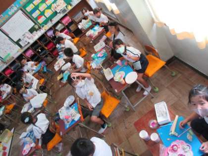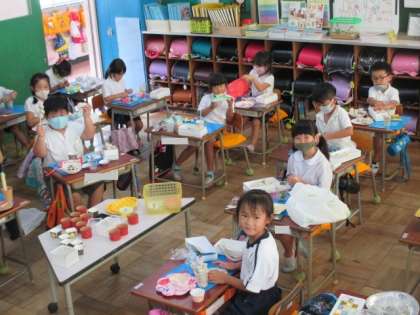 粘土を使って思い思いにごちそうを作りました。家から持って来た紙皿やカップに盛り付けています。
