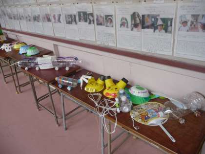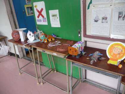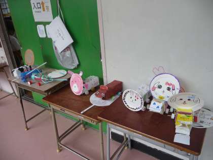 2年生が、「ウキウキあそびランド」のテーマで作った作品が、廊下に展示されていました。