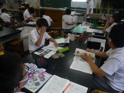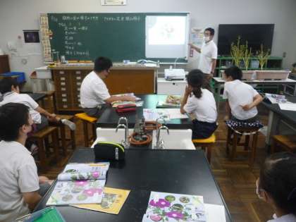 理科の授業です。「植物の実や種子のでき方」をテーマに、学習を進めています。