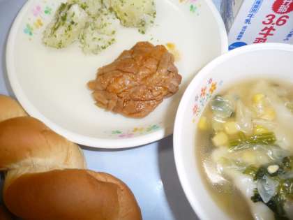 鶏肉、こふきいも、ラビオリスープのどれも子供たちが好きなタイプのメニューだと思います。
