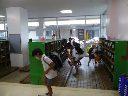 児童玄関を開ける直前に、雨が激しく降り始め、あわてて軒下に駆け込む子供たちがいました。