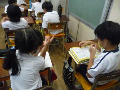 社会の授業です。「ごみを分別するのはなぜか」を考えています。