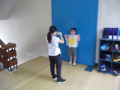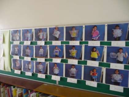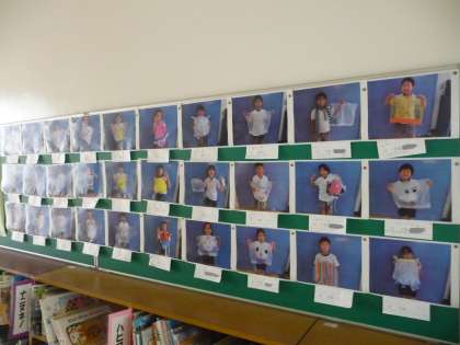 3年生の図画工作で制作した作品が、本人と一緒に写真として掲示されていました。