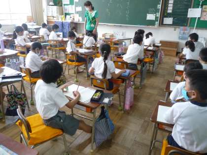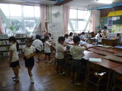 国語の書き取り練習を終えたら、図書室で本を選びます。