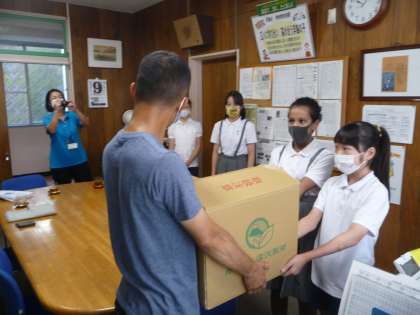 来校してくださった支部の大村さんから、6年生の代表児童がお茶を受け取りました。