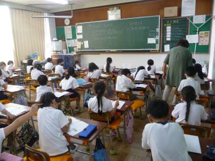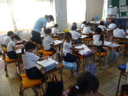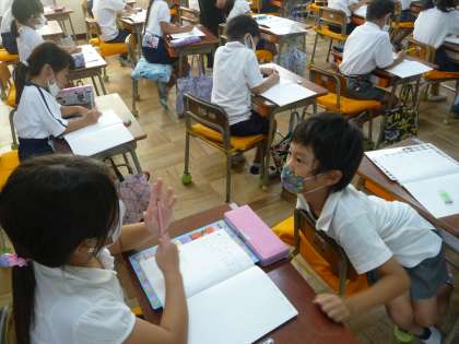 算数の授業です。足し算と引き算を続けて行う練習をしています。できるようになった子が、近くにいる子に教えてあげている姿も見られました(3枚目)。