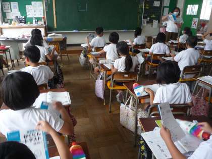 算数の授業です。「かさ(量)」の学習の復習をしたら、ドリル練習に挑戦です。