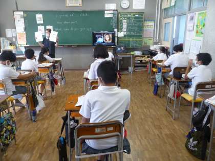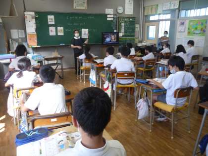 英語の授業です。「What time〜?」のパターンを使って、一日の生活について会話をする練習に取り組んでいます。