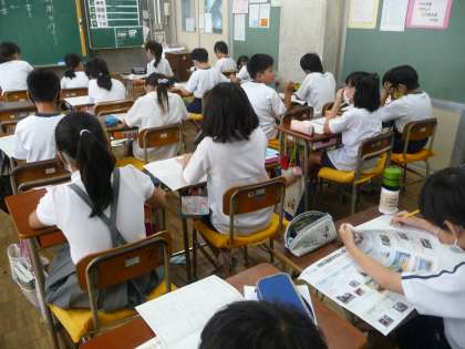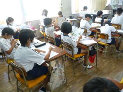 社会の授業です。社会科見学で学んだことの新聞づくりに、黙々と取り組んでします。