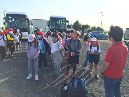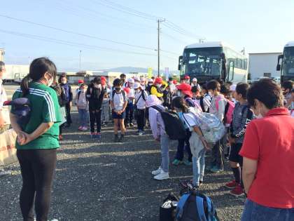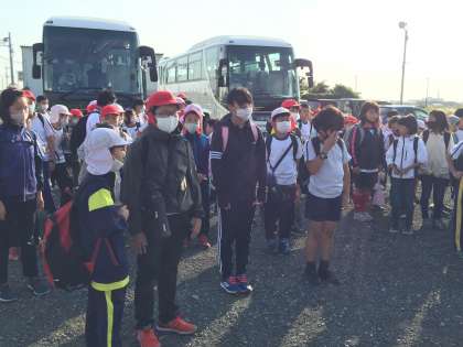 バスから降りる4・5年生の子供たちは、少し疲れているようでした。桃沢野外活動センターで、一生懸命に活動したことがわかります。