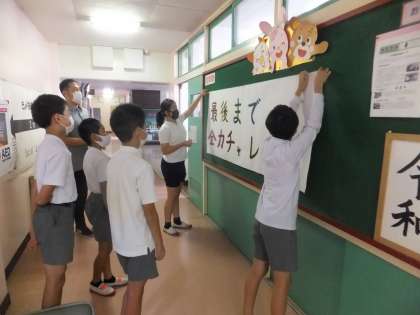 子供たちのがんばろうという気持ちがあふれているように感じます。スポーツデーのスローガンも、このスローガンを使うそうです。スローガン達成に向けてみんなでがんばりましょう。