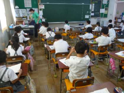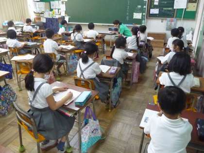 国語の授業です。教科書の本文の範読を聞いています。