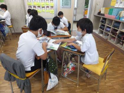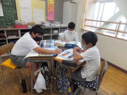 なぜ生産量が減ったのかを3人組になって、それぞれの資料から見つけて話合いをしていました。