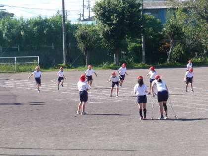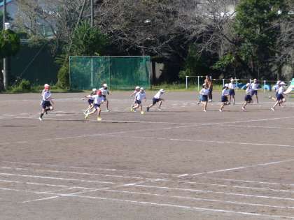 体育の授業です。リレーのバトンの受け渡しの練習をしています。