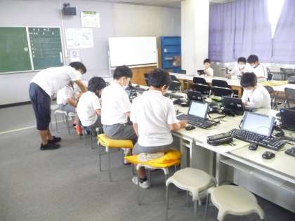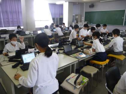 社会の授業です。日本の食糧自給率などを、コンピュータ室で調べています。