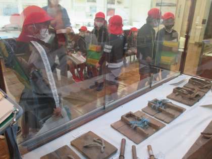 ヤマカ水産の後、沼津市歴史民俗資料館に行きました。昔の生活用具や農耕用具を見たり、火起こし体験をしたりしました。