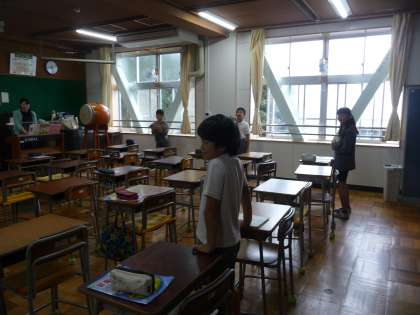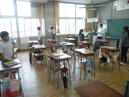 音楽の授業です。音楽室と教室に分かれて、音取りの練習をしています。