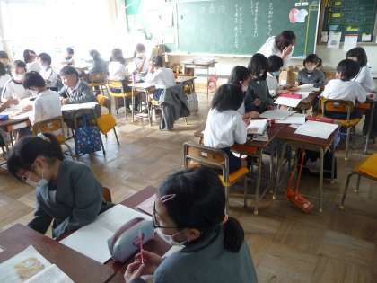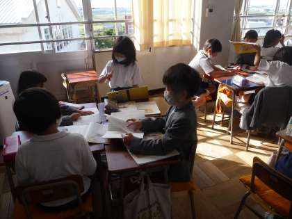 国語の授業です。物語を読んで、感じたことを互いに話して交流しています。