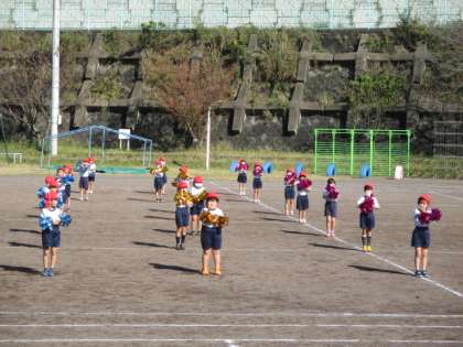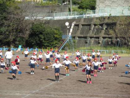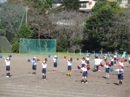 運動場で、ポンポンを使ってダンスの練習をしました。