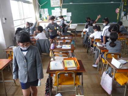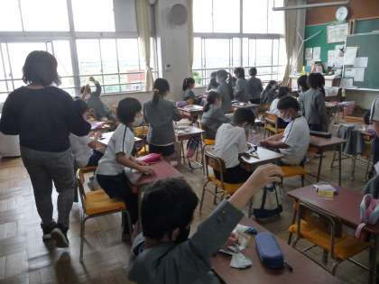 算数の授業です。かけ算の九九を練習しています。自分で自信がついたら、友だちに確認してもらっています。
