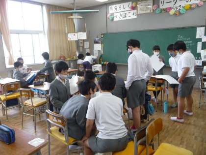 グループになって、防災について発表する資料づくりを行っています。