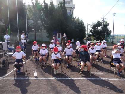 子供たちが張り切って、グラウンドに出てきました。1年生のいすは、6年生が運んでくれました。
