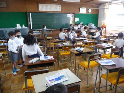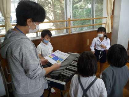 音楽の授業です。いろいろな楽器を使って、楽しそうに活動しています。