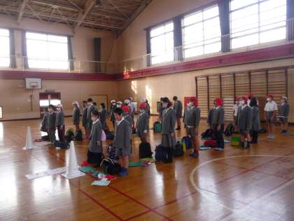 体育館で、出発の会をやったら、社会科見学に出発です。