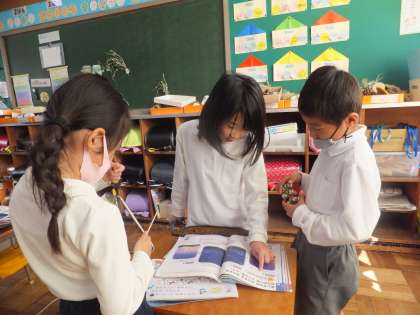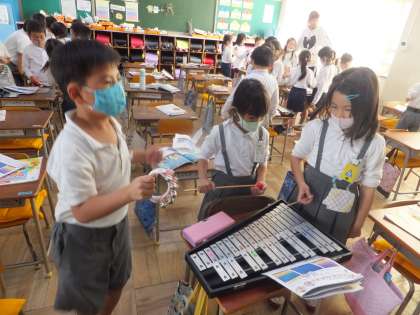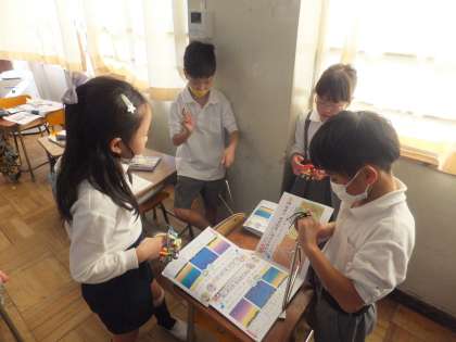1年生は、音楽の時間にグループに分かれて、音作りをしていました。星や魔法使いの音をいろいろな楽器で表し、曲に合わせて演奏していました。