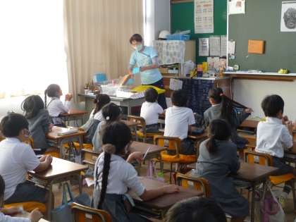 図画工作の授業です。紙版画のやり方について、説明を聞いています。これからどんな活動をするのか、ワクワクしているのが分かります。