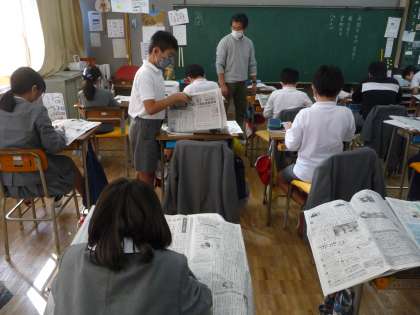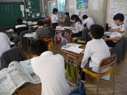 国語の授業です。新聞記事の要約をする学習で、新聞記事を選んでいます。