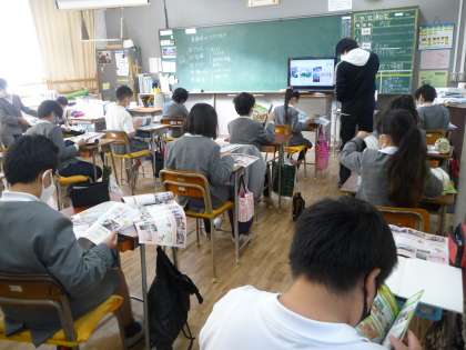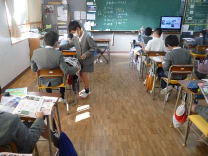 社会の授業です。先生の指示で、資料や教科書を使って、調べ学習中です。