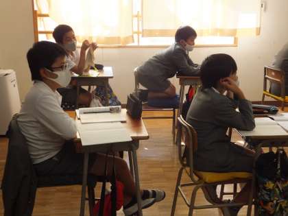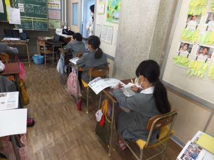 5年1組は、社会科の授業で、自動車の組立て工場のビデオを見ていました。どの子も、身を乗りだして真剣でした。中には、大切なことをさっとメモする子もいて感心しました。