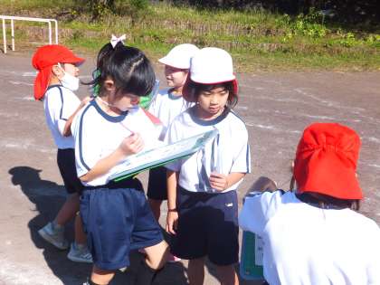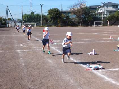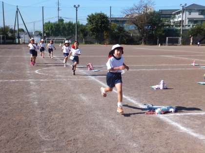 1年1組は、体育の時間に持久走の練習をしていました。どの子も、歩かずに、真剣に走っていました。自分の記録を伸ばすためにがんばっていて立派です。