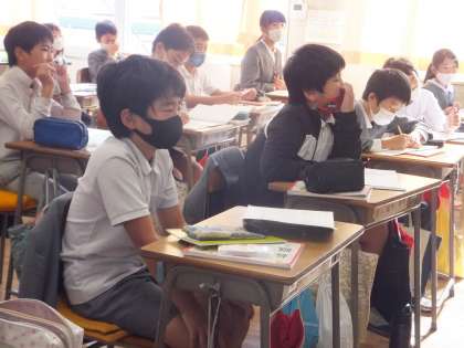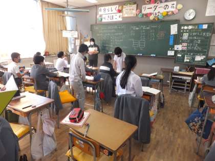 5年2組は、算数の授業をしていました。分数の問題に挑戦していました。分数の学習は難しい内容です。しかし、5年生の子供たちは、どの子も意欲で、いろいろな解き方を考えて、それを発表していました。