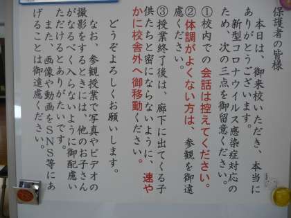 児童玄関と運動場側の玄関に、注意事項が掲示してあります。