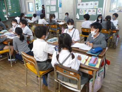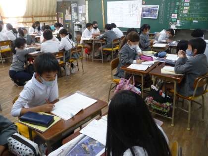 11月17日 3年生 授業風景 公開日 2020/11/17 更新日 2020/11/17 学校生活 国語の授業です。一枚の絵を手がかりにして、どんな情景なのかグループで話し合いながら、表にまとめています。 いいね(0) 3年生