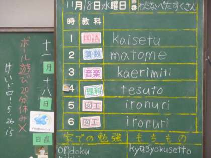 ローマ字の習い始めで、予定黒板の教科の内容がローマ字で書かれています(3枚目)。