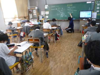 社会の授業です。自動車工業で、現地生産をする利点について考えています。