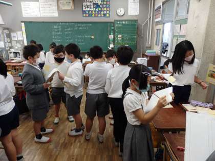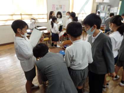 国語の授業です。絵を見て感じたことを、互いに交流して知らせています。