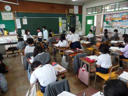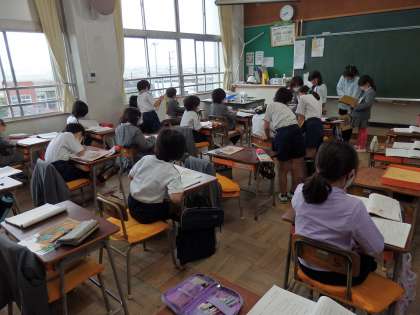 国語の授業です。教科書の問題を解いて、先生に確認してもらっています。