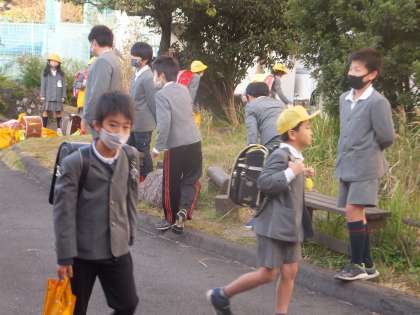 今週は、運営委員会が企画した「あいさつ運動」を行っています。6年生から順番にあいさつ当番を行って、今日は、5年生の当番です。