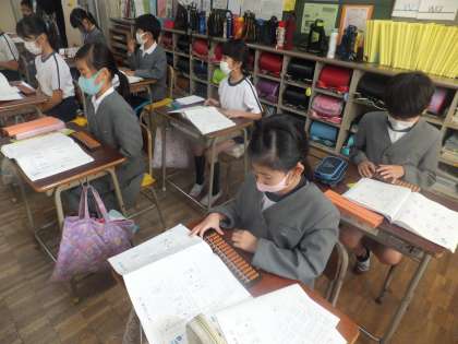 「チーム学校」実現事業の一環で、地域でそろばん教室を開かれている大村さんをお招きして、3年生、4年生を対象にそろばんの授業をしていただきました。