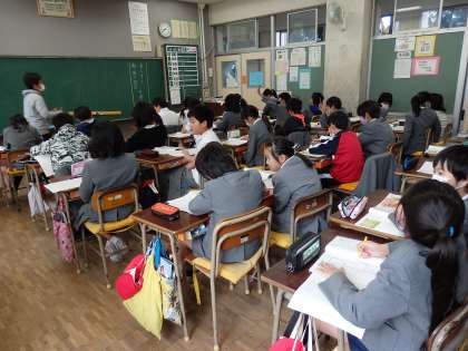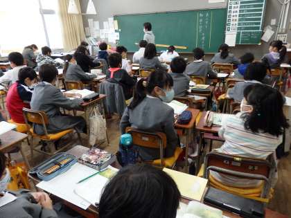 国語の授業です。ワークシートにしたがって、物語の読み取りをやっています。