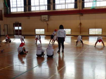 体育の授業です。馬跳びのコツの確認をしたら、2人組で練習してみます。