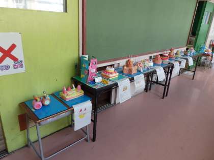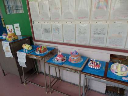図画工作の授業で作った、粘土のケーキが廊下に展示されています。色とりどりで、子供たちの思いがよく表れたケーキです。