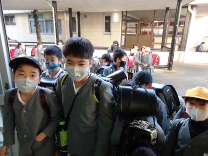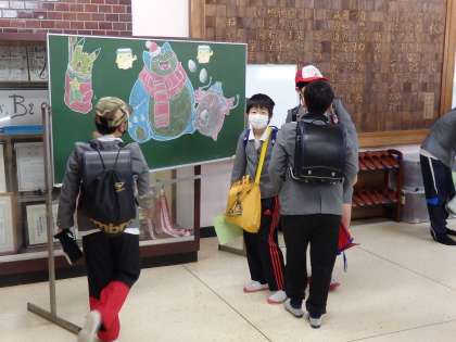 模様替えした、子供たちを出迎えるチョークアートに、早速興味を示す子供たちもいました。