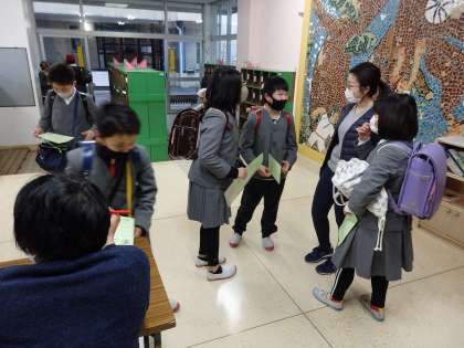 今朝は、1年生が、あいさつ当番でした。高学年の子たちが、世話をしていました。