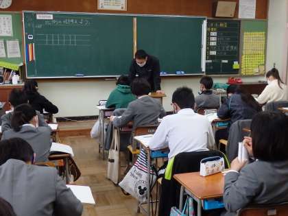 算数の授業です。比例の式の学習です。小学校の学習も、大分難しくなってきました。