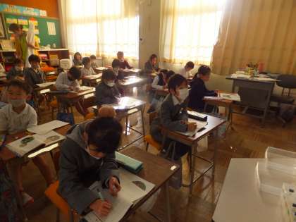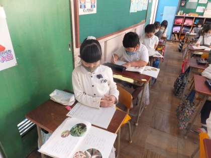 1年生は国語の授業でした。順序を表す言葉を手がかりに、説明文「まめ」を読み取っていました。